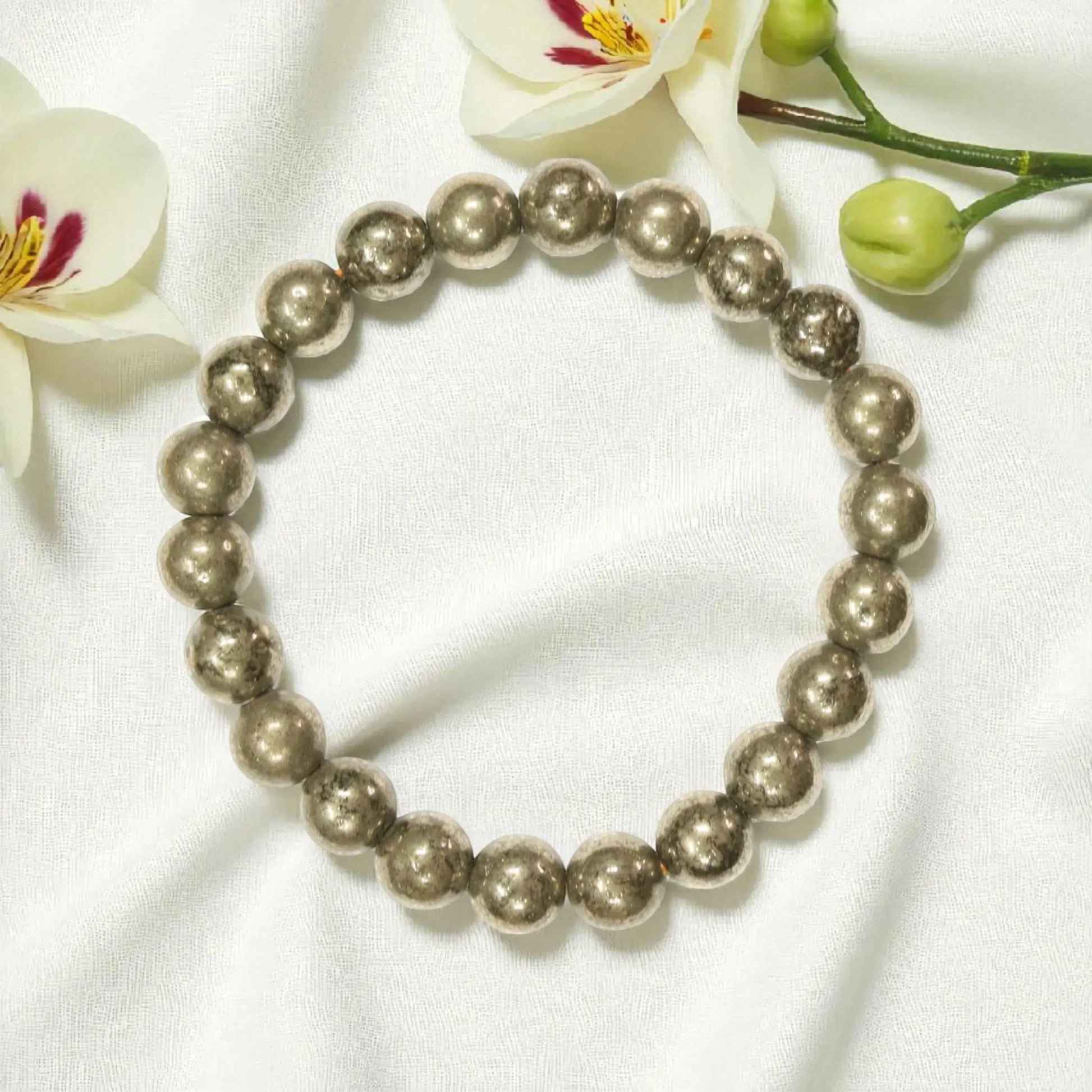 Crafted with precision and passion, our 8 mm Pyrite Bracelet is more than a stylish accessory—it's a wearable source of empowerment. Each bead carries the natural luster of golden Pyrite, known for its grounding properties and association with prosperity and protection. The rich metallic sheen adds a touch of refined masculinity or elegance, making it a staple for both men and women.